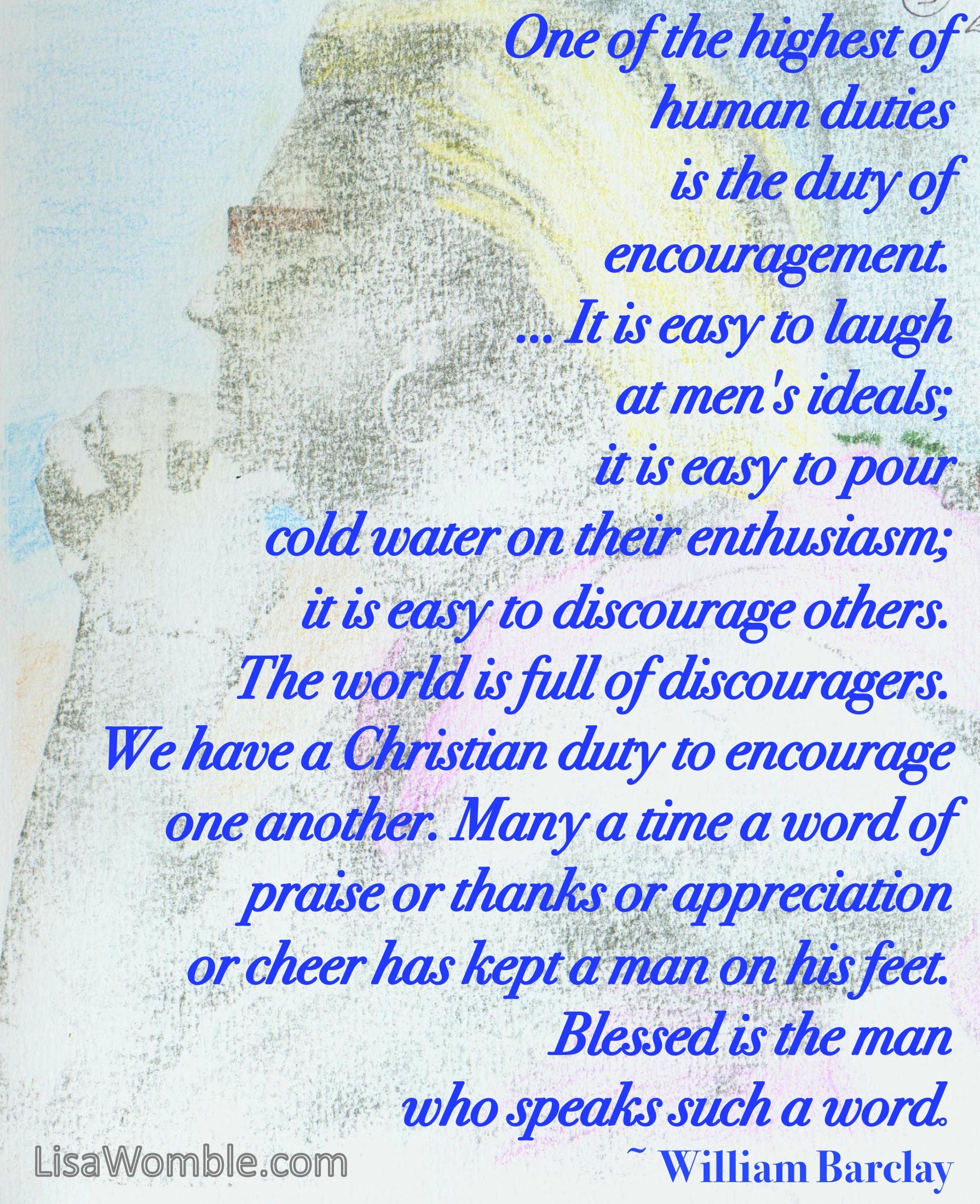 As Barclay notes, it just seems to be easier to discourage one another than to encourage. And yet, encouragement is such a wonderful and much needed thing. How powerful it could be if we set our minds on becoming more encouraging people. Unfortunately, the rigors of everyday life keep us from developing this ministry as we should. It takes focus and practice; it is something we must be intentional about doing. So, I thought, maybe if even just a few people decide to be intentional about developing encouragement skills … And thus, this devotional series was born.