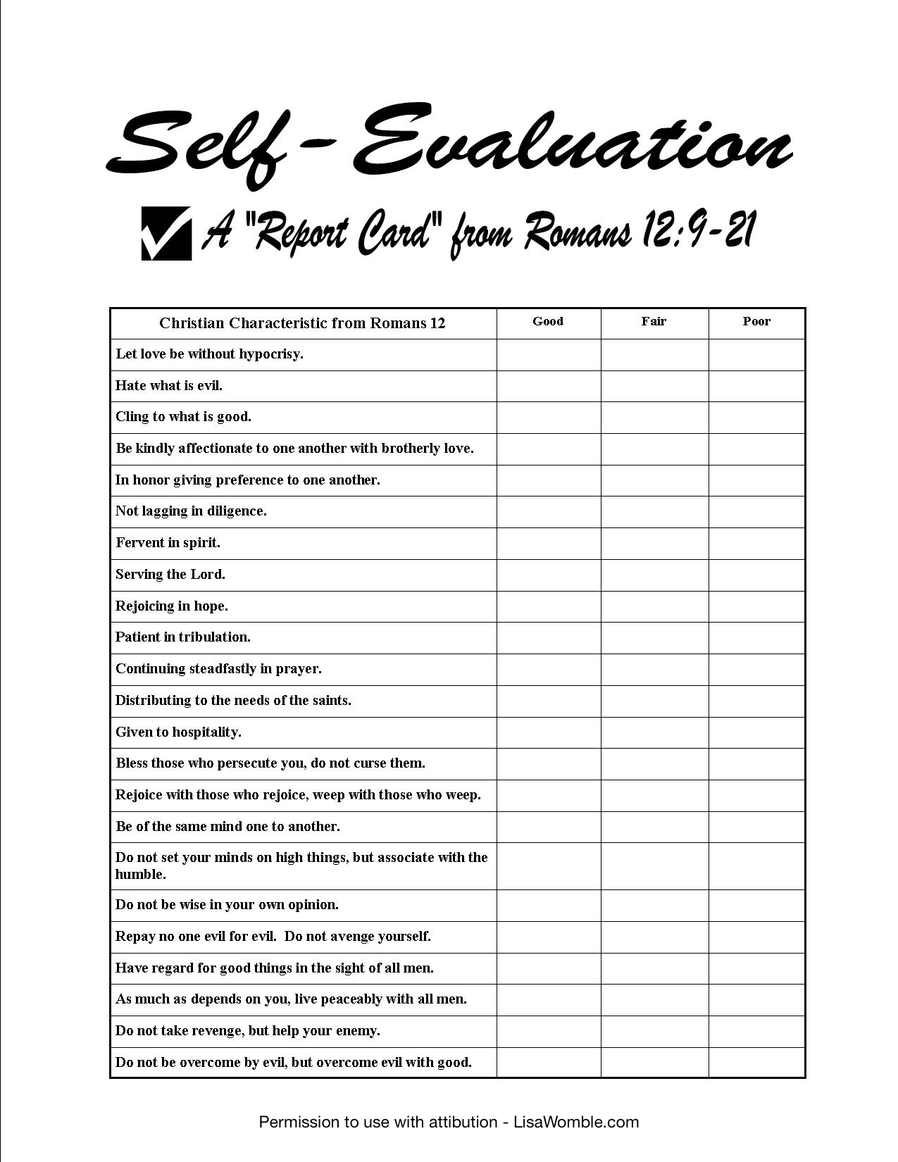 The picture above shows a “Report Card” I used with a Sunday School class. I’ve included it as an example of creating a way to do a self-evaluation from a scriptural text. I thought you might want to complete it on your own to reinforce the need to use the Word to evaluate our progress and indicate areas which might need improvement. You might want to make up your own “report card” for any passage of Scripture you want to live by and use as a measure of your spiritual growth. If you did, what texts might you chose (some possibilities are listed in the devotion)?